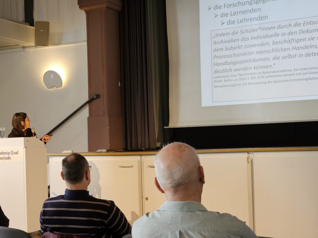 Podiumsteilnehmer*innen: Prof. Dr. Wolfgang Benz, Jugendliche, Dr. Sandra Zimmermann (Stadtarchiv Darmstadt), Kirsti Ohr (Darmstädter Geschichtswerkstatt) und Harald Höflein (Archivpädagogik Darmstadt).
