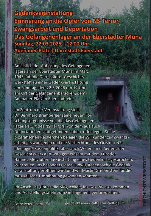 Am Sonntag, den 27. 4. 2025, beteiligte sich die Geschichtswerkstatt an der Muna-Tagung der Dotter-Stiftung mit der Vorstellung einer Projektidee zum Gefangenenlager der Eberstädter Muna. Vorgestellt wurde das Vorhaben am Konrad-Adenauer-Platz, an dem Ort, an dem das Gefangenenlager der Muna Eberstadt sich befand, eine Gedenkskulptur zu errichten und mit Jugendlichen zu dem Ort zu arbeiten. Der Vortrag fand unter dem Themenblock 9 (Pädagogische Arbeit) im Ernst-Ludwig-Saal in Eberstadt statt und ist hier einsehbar.